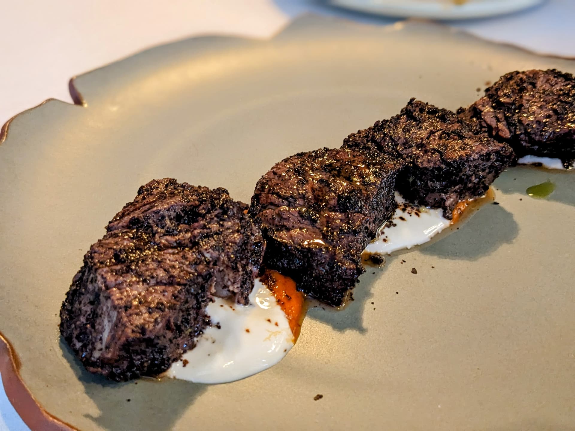 dry-aged tenderloin shish kebab - sumac-cured, served with smoked pepper sauce, house-made yogurt, herb oil, and lavash bread