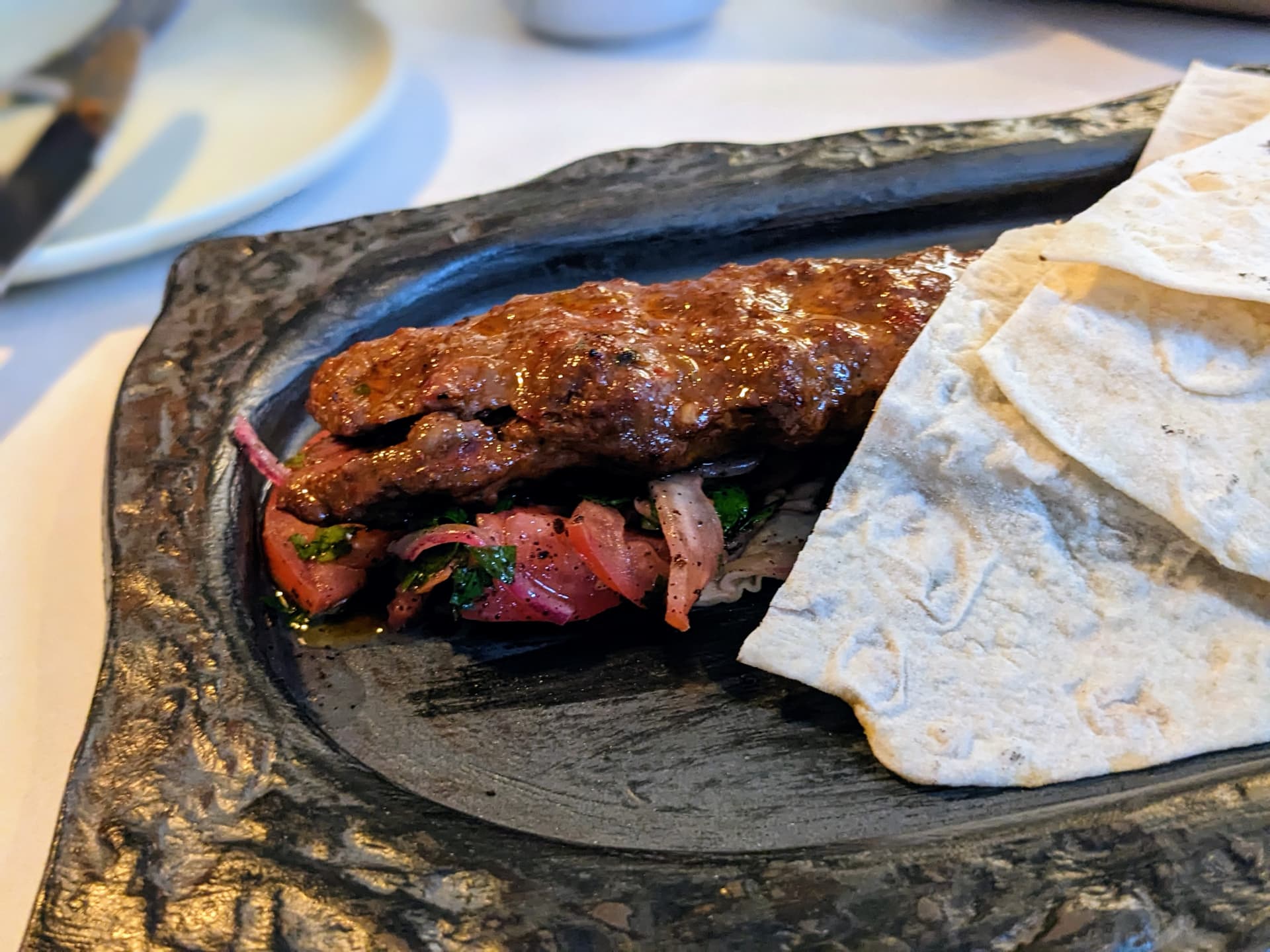 garlic-spiced kebab - a richly seasoned kebab made with garlic, served with tomato & onion salad and lavash bread