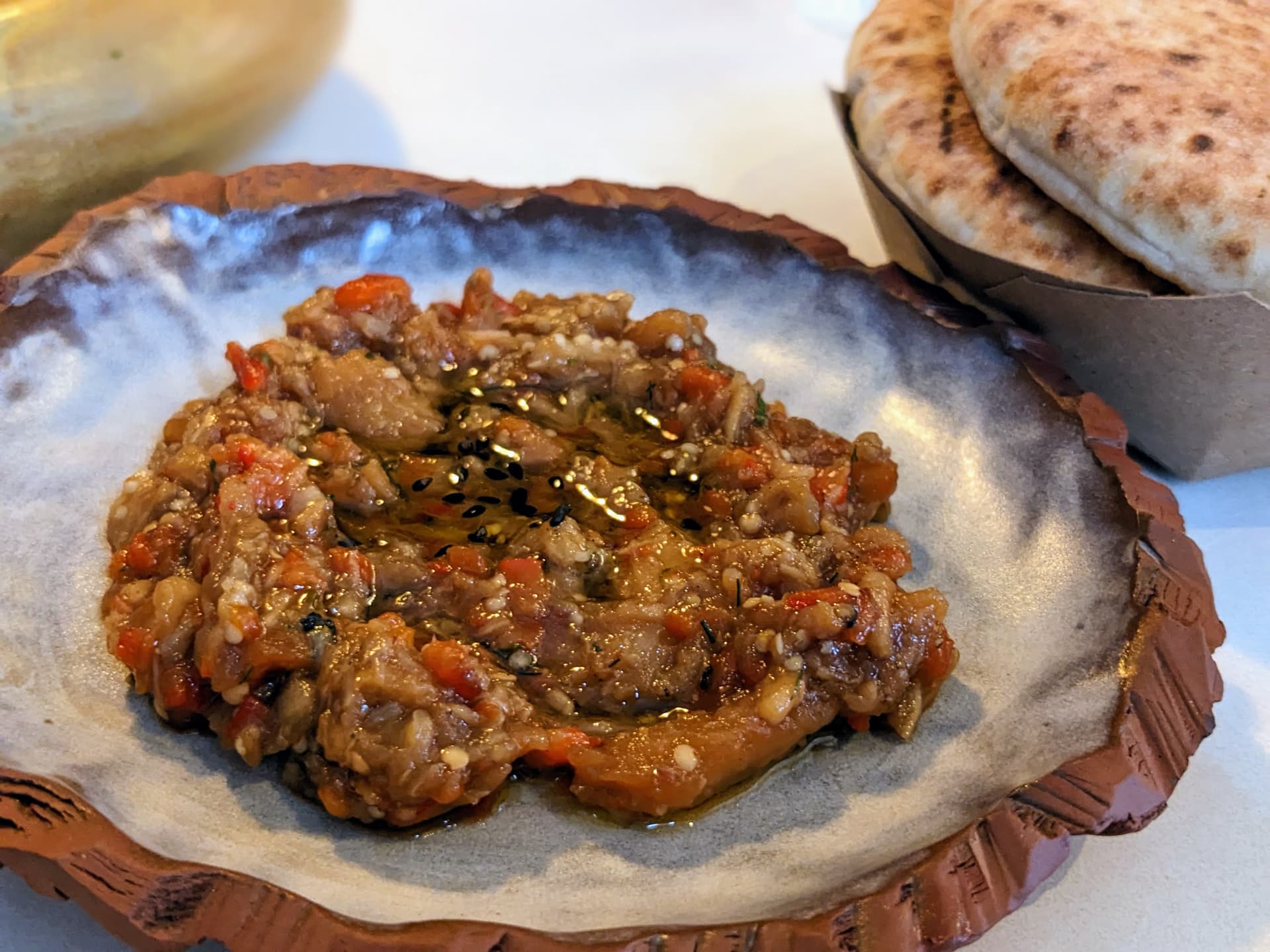 japanese eggplant salad - grilled eggplant and bell pepper, gochujang sauce, togarashi mayo, pomegranate molasses, herbs and evoo
