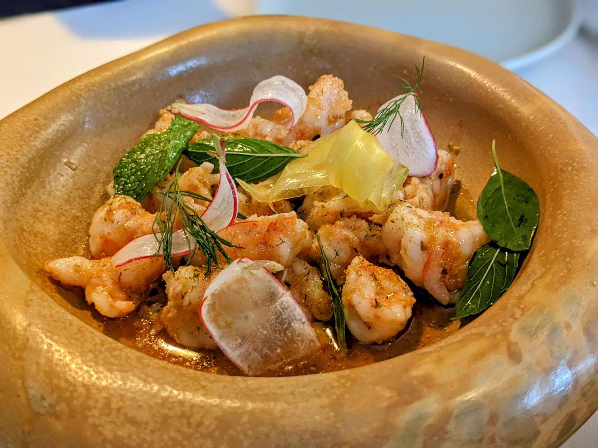 shrimp in tarhana butter - shrimp with tarhana-infused butter—a traditional fermented dried food—yuzu kosho, and fresh herbs
