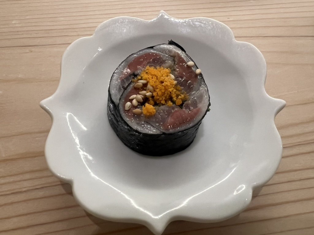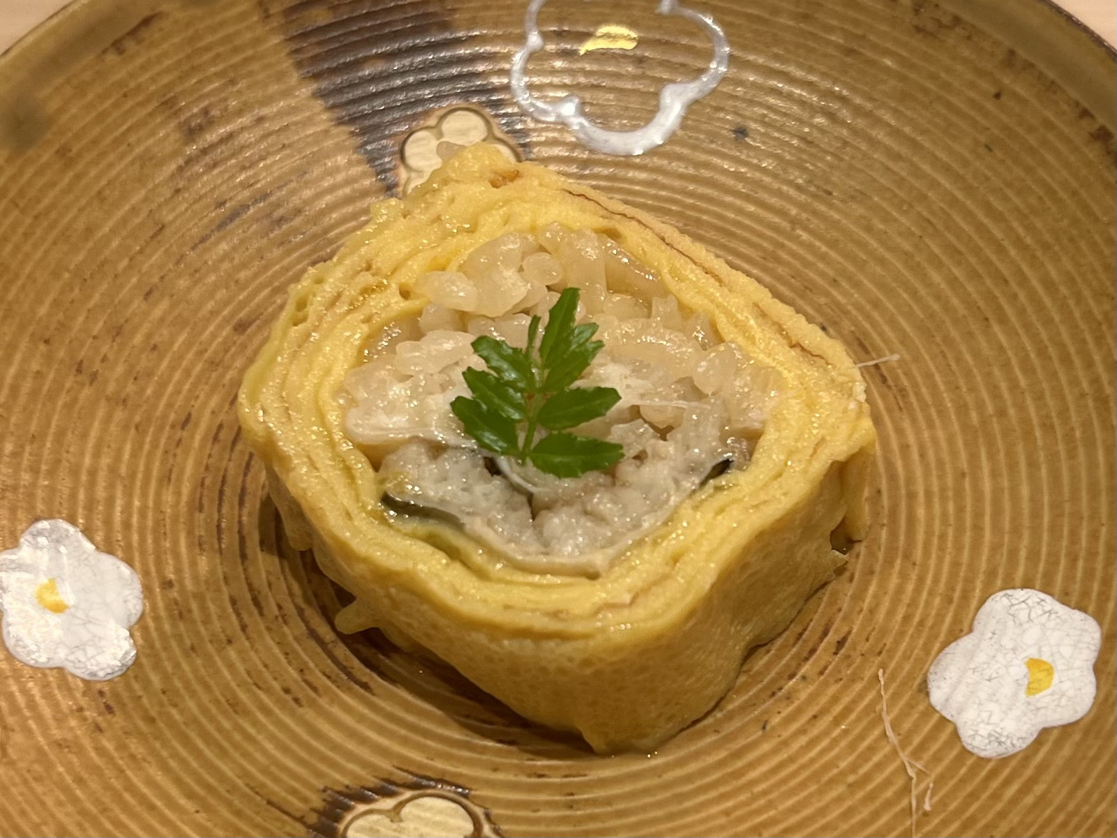 Anago bozushi umaki wrapped in a thin dashimaki tamago and topped with kinome. Highlight. Love the creativity on this and it requires a bit of work and skill