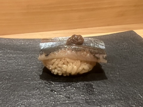 Sanma with liver soy. Excellent plush sanma with good fatty balance - the rice’s quick sourness worked well.