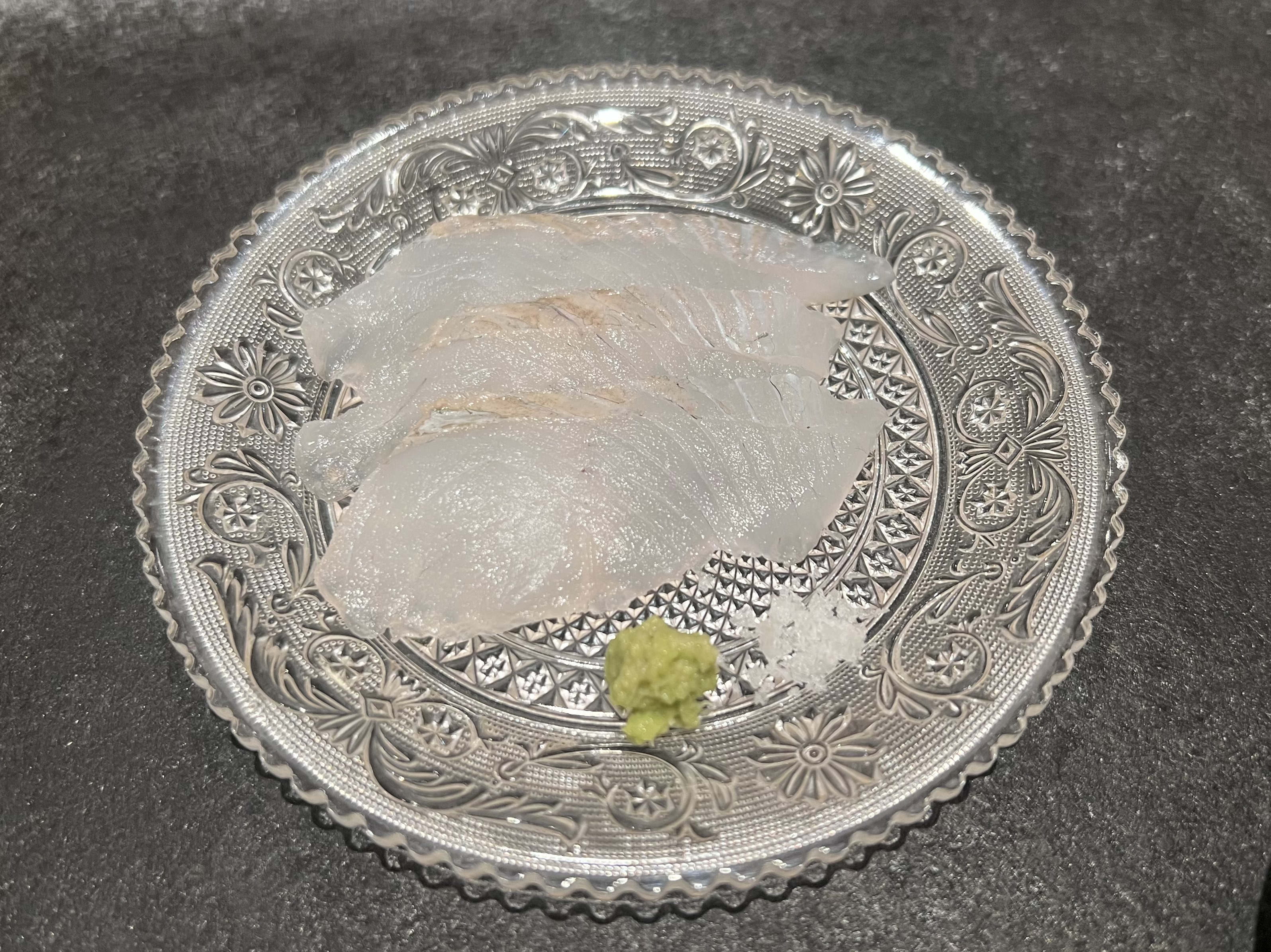 Matsukawa karei from Hokkaido - excellent toothsome crunch, perfect. On vintage Baccarat.