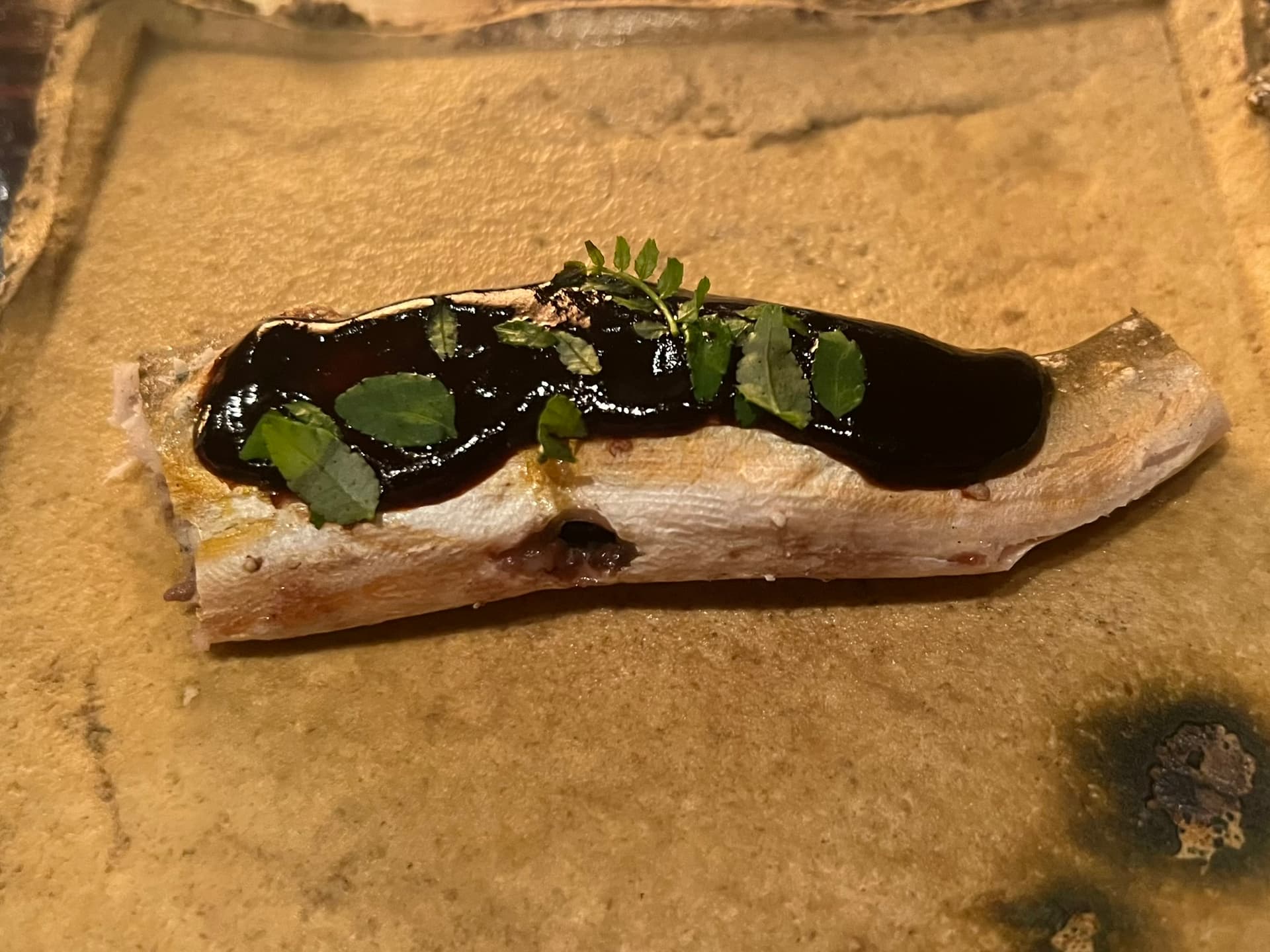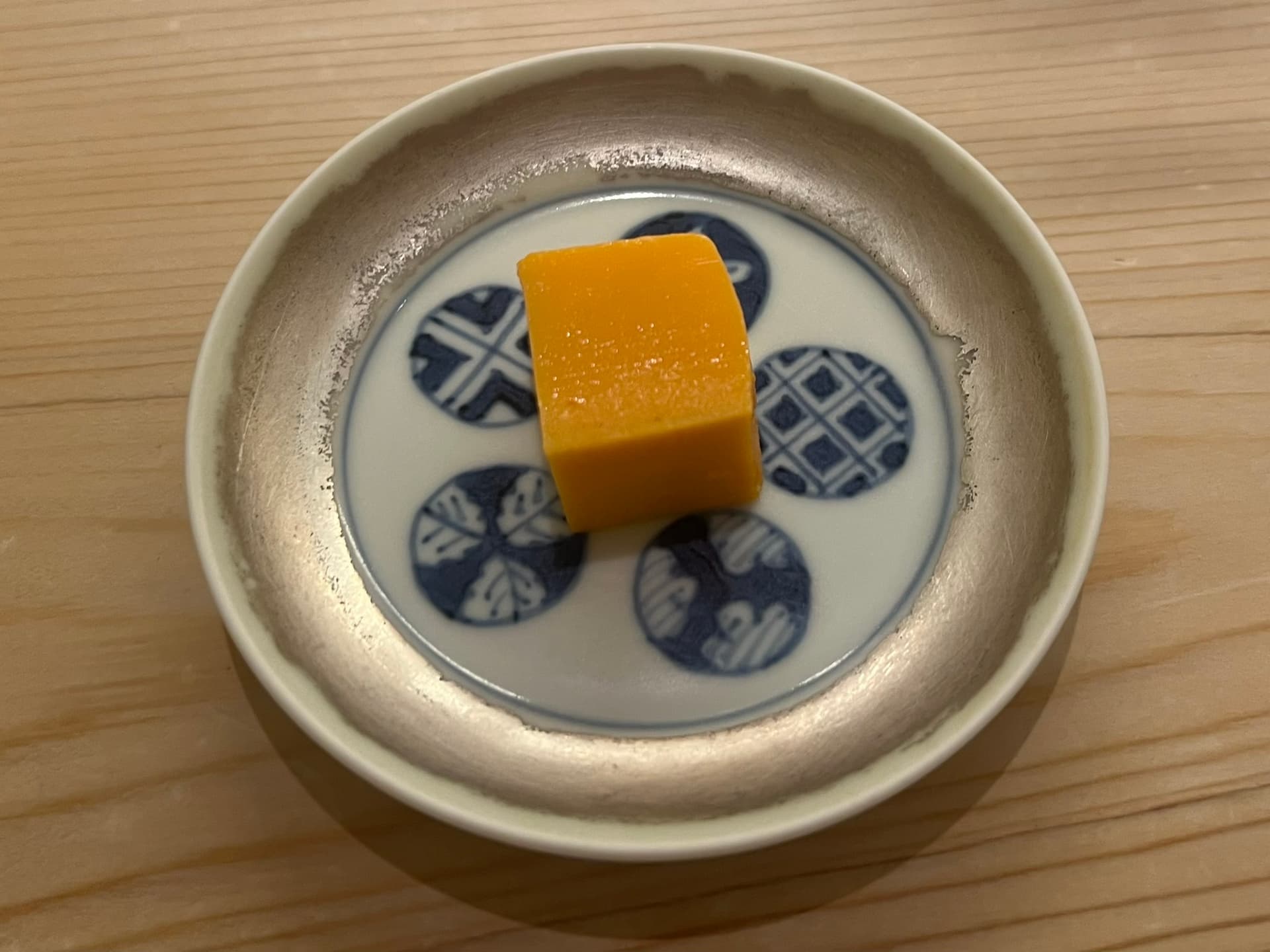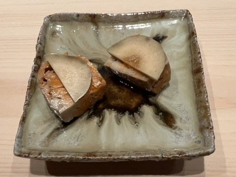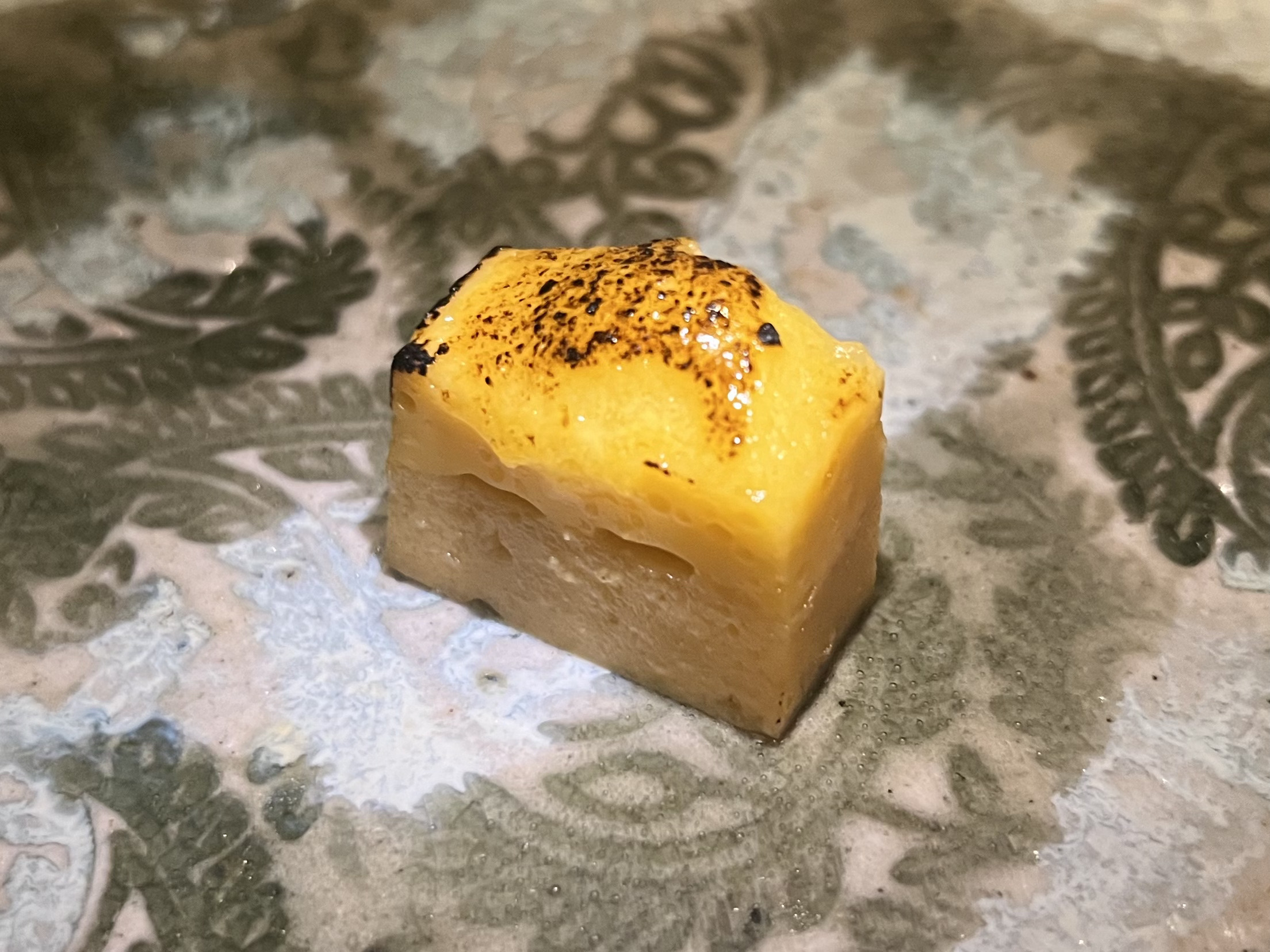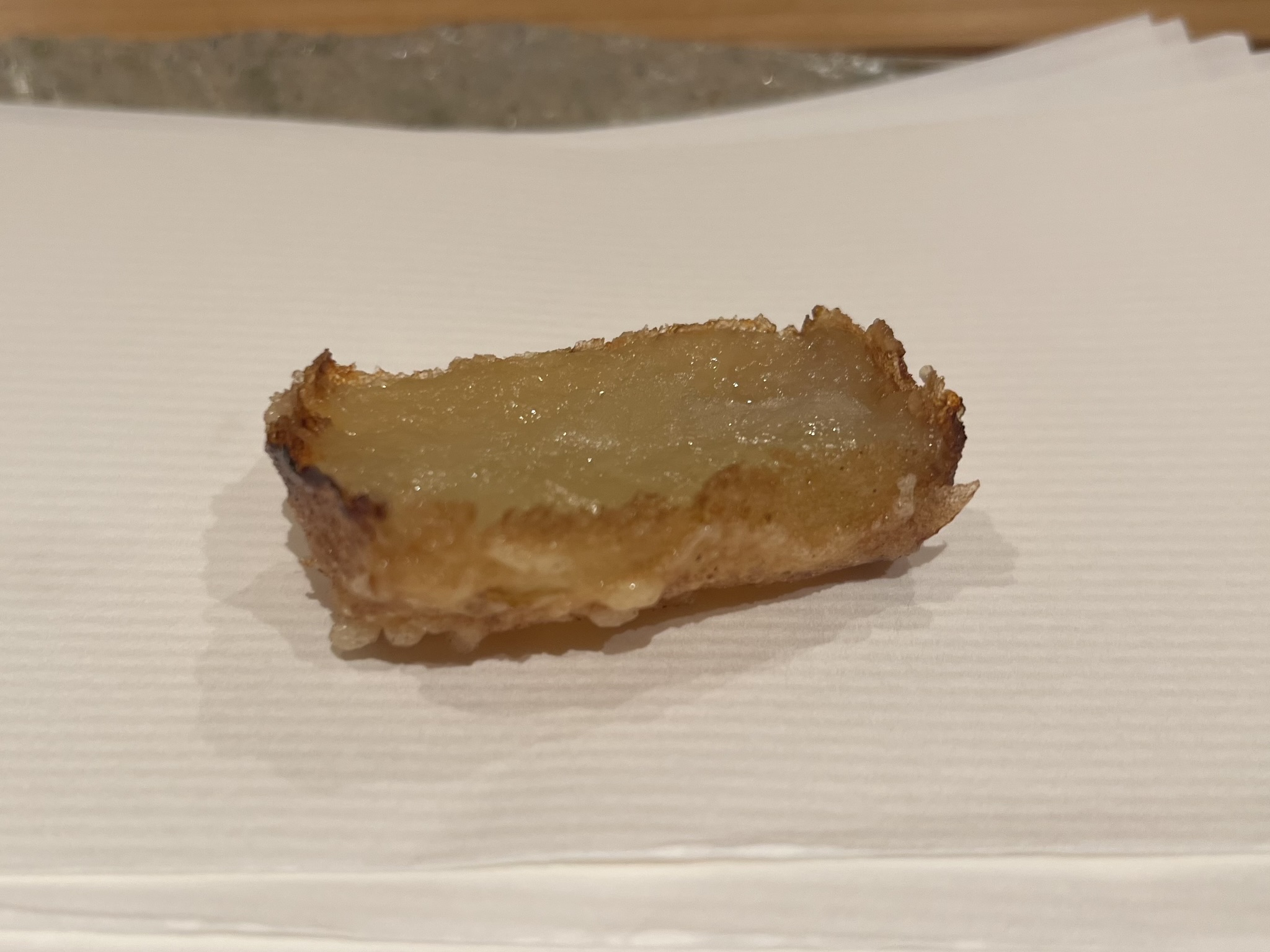 Yukimuro potato - aged 18 months. This ending piece is a done longer and a little darker as it has a lot of sugars so they want a crumbly / melty interior and a caramel-like taste. Last time it was carrot. This potato is long aged in a very humid but freezing temp snow-packed house to concentrate its sugars. Incredible!