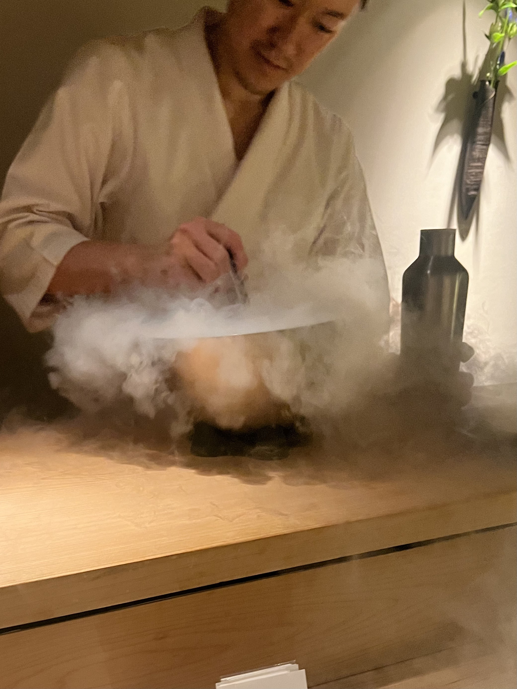 - Sushi Fukuzuka, 1st visit. Chef here is a sushi geek and this is one of those places like Namba Hibiya that lists the temperature of both shari and neta for each serving. Style is a bit different here - it’s dim, there’s bright lamps at each seat to highlight the serving, there are 3 types of gari, 3 types of wasabi, 3 gaeshi movements displayed (but mainly hontegaishi with some showy flair), soup is soba in maguro dashi, dessert is ice cream is made with liquid nitrogen at the bar, etc. You choose your chopsticks to start (each made of different wood) and there’s a lot of wood around in general but some might find the dim setting unique, some might find it a little bit cold. Overall the chef is talented and definitely doing things a bit differently indeed.