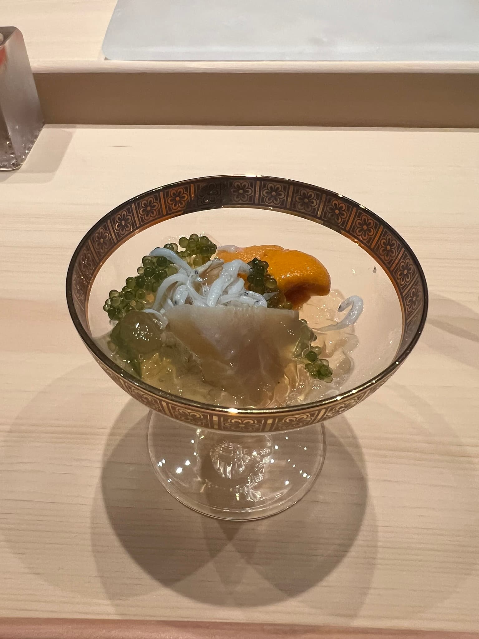 Kuroawabi (from Chiba), shirauo, abalone jelly, umibudo. Nicely textured start.