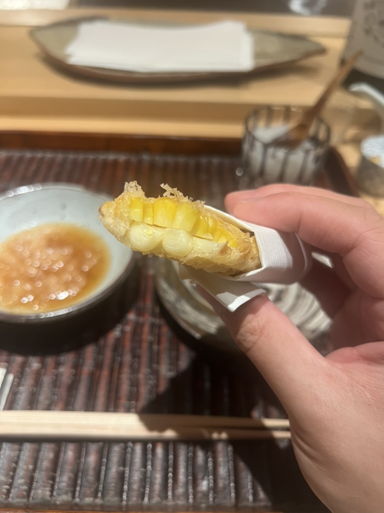 Double corn - yellow corn from Hokkaido and white corn from Aomori, sandwiched and medium rare with excellent umami, sweetness, and snappiness. Great with Hyakumangoku no Shiro sake, from the makers of Tedorigawa (Yoshida). Excellent transparent sweetness not from the sake so much as amplifying the natural sweetness of the corn (also great with anago and yuzu at Sushi Shunji)