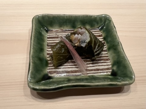 Iwashi Namerou wrapped in pickled mazuma wasabi leaves.