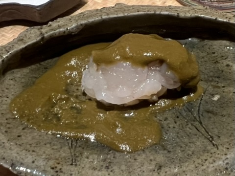 Kuroawabi - encored serving the liver sauce with shiroebi balled up to look like shari (pictured)!