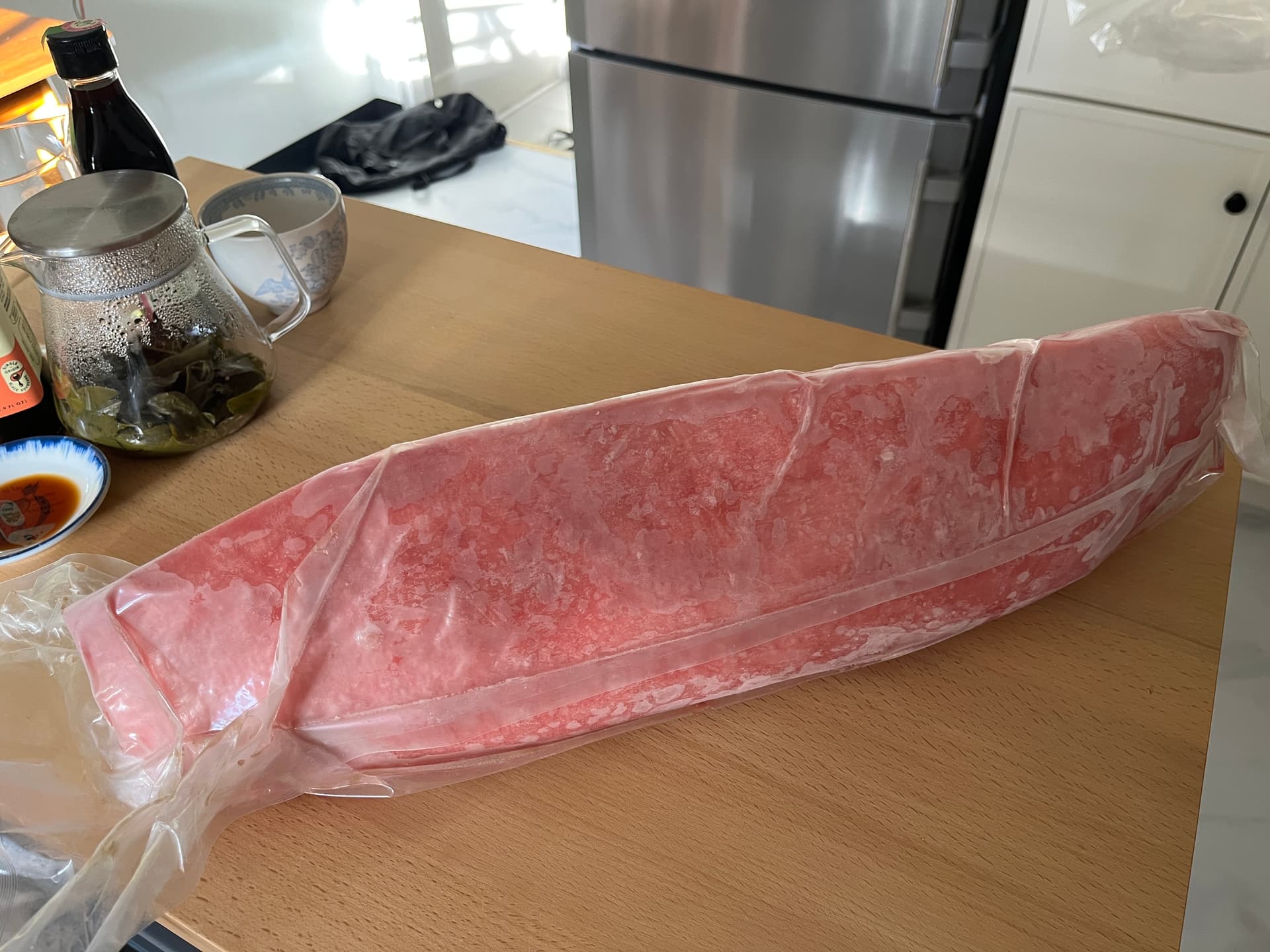 They suggested having a fishmonger break it down for a fee. If DIY, then cut it frozen with a stainless steel knife (In contrast, I assume, with the alloys used in forged knives?).